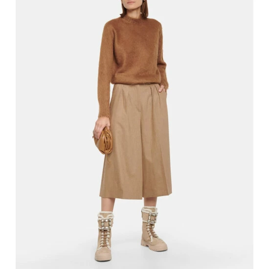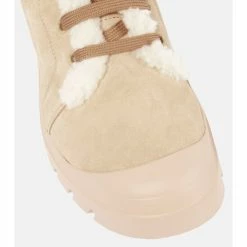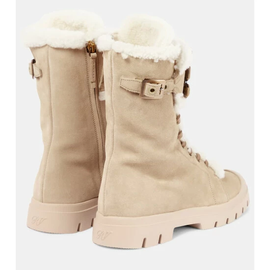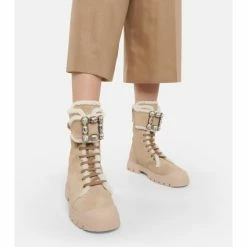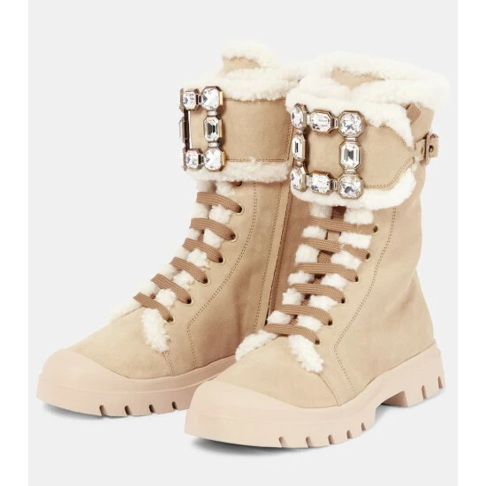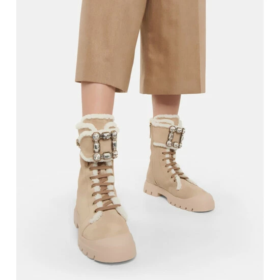 Roger Vivier elevates tough-luxe combat boots with the beige suede Walky Viv’ pair. They’re practically made with cleated soles, a tactile shearling lining and trims, and encrusted with magnified crystal buckles.